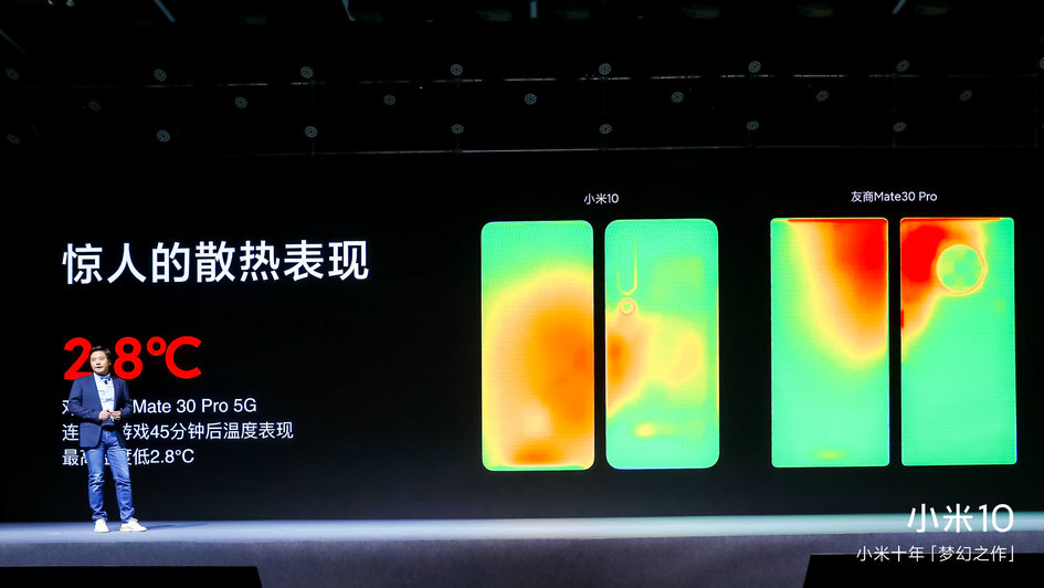 一套完整的散热体系覆盖下,小米10 相较于 Mate30 Pro 提供了更强的散热表现,45 分钟后温度低 2.8℃。